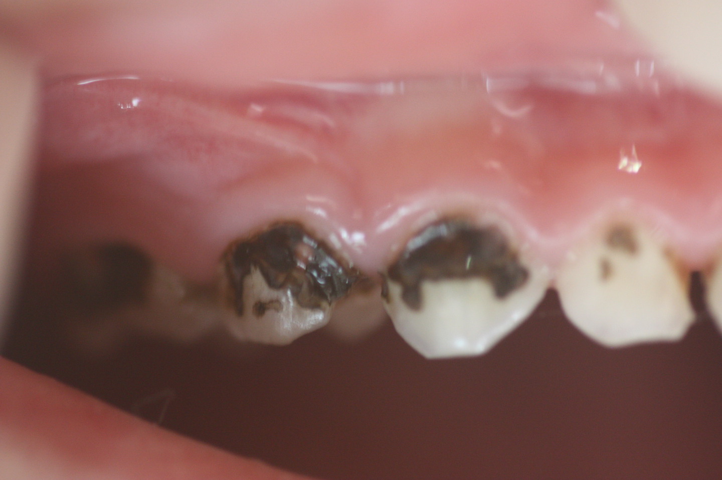 ですが、乳首をくわえたまま寝てしまうと、上唇と歯の間に母乳が溜まり寝ている間は唾液が出づらく洗いながされる事がないので、写真のように広い面で白く脱灰(溶ける)してしまうのです。